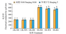 在盆钵栽培条件下研究了小麦秸秆(WS)和油菜秸秆(RS)处理对盐胁迫(SS,盐处理浓度0.2%)下南粳9108和华粳5号2个水稻品种产量和品质的调控效应。结果表明,与无盐处理(CK)相比,SS处理显著提高了土壤电导率并降低了2个水稻品种叶片的K+/Na+值。2种秸秆处理较无秸秆(NS)处理均能降低SS处理下的土壤电导率,提高2个水稻品种叶片的K+/Na+值。与CK相比,SS处理使南粳9108和华粳5号的产量分别降低了59.9%和64.5%。在SS条件下,与NS处理相比,WS和RS处理提高了2个品种的每盆穗数和每穗粒数,使南粳9108和华粳5号产量分别增加了60.9%、63.5%和63.5%、71.6%,大幅度缓解了由于盐胁迫造成的产量损失。与CK相比,SS处理显著降低稻米加工品质和蒸煮食味品质,但有利于改善外观品质和营养品质。与NS相比,WS和RS处理改善了盐胁迫下稻米的加工品质、外观品质和食味品质。RS处理更有利于改善稻米加工品质和外观品质,而WS处理则更有利于提高稻米的的食味值和蒸煮食味品质。综上,小麦秸秆和油菜秸秆处理能缓解盐胁迫造成的水稻产量损失并改善部分稻米品质指标,油菜秸秆处理优于小麦秸秆处理。