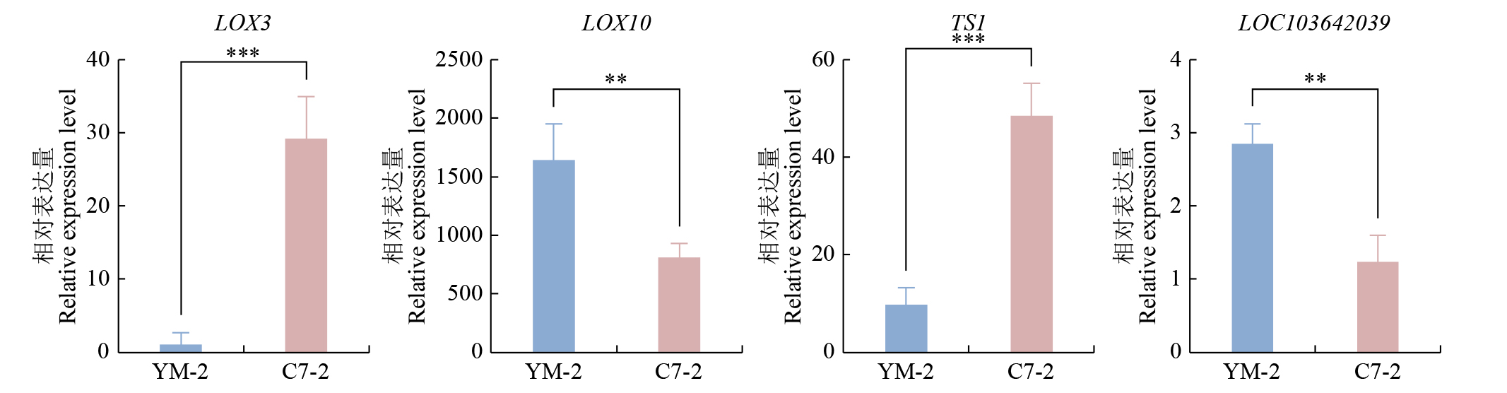 摘要: 亚油酸作为不饱和脂肪酸,对人体健康至关重要。以自主育成的高亚油酸玉米自交系YM-2和普通玉米自交系昌7-2为试验材料进行转录组学分析,挖掘玉米亚油酸生物合成相关候选基因和关键通路。结果表明,2个比较组共鉴定到6505个差异表达基因(differentially expressed genes,DEGs),其中3381个基因上调表达,3124个基因下调表达。KEGG富集分析表明,DEGs被显著富集在亚油酸代谢(Zma00591)和脂肪酸延长(Zma00062)等代谢途径中。其中,亚油酸9S-脂氧合酶(EC:1.13.11.58)、亚油酸13S-脂氧合酶(EC:1.13.11.12)、3-酮脂酰-CoA合酶(EC:2.3.1.199)和17β-雌二醇17-脱氢酶/极长链3-氧代酰基辅酶A还原酶(EC:1.1.1.62/ 1.1.1.330)表达下调,相关候选基因LOX1、LOX3、LOX6、LOX10、LOX12、TS1、LOC103642039和LOC103646607可能与亚油酸的合成直接相关。为验证RNA-seq数据的准确性,选取在2份材料中表达模式相反的4个基因进行qRT-PCR验证,发现基因表达量的变化趋势与转录组测序结果一致。本研究挖掘玉米亚油酸生物合成的相关基因和代谢通路,为深入解析玉米高亚油酸的分子调控机制提供参考,也为高油酸农作物的分子育种奠定基础。