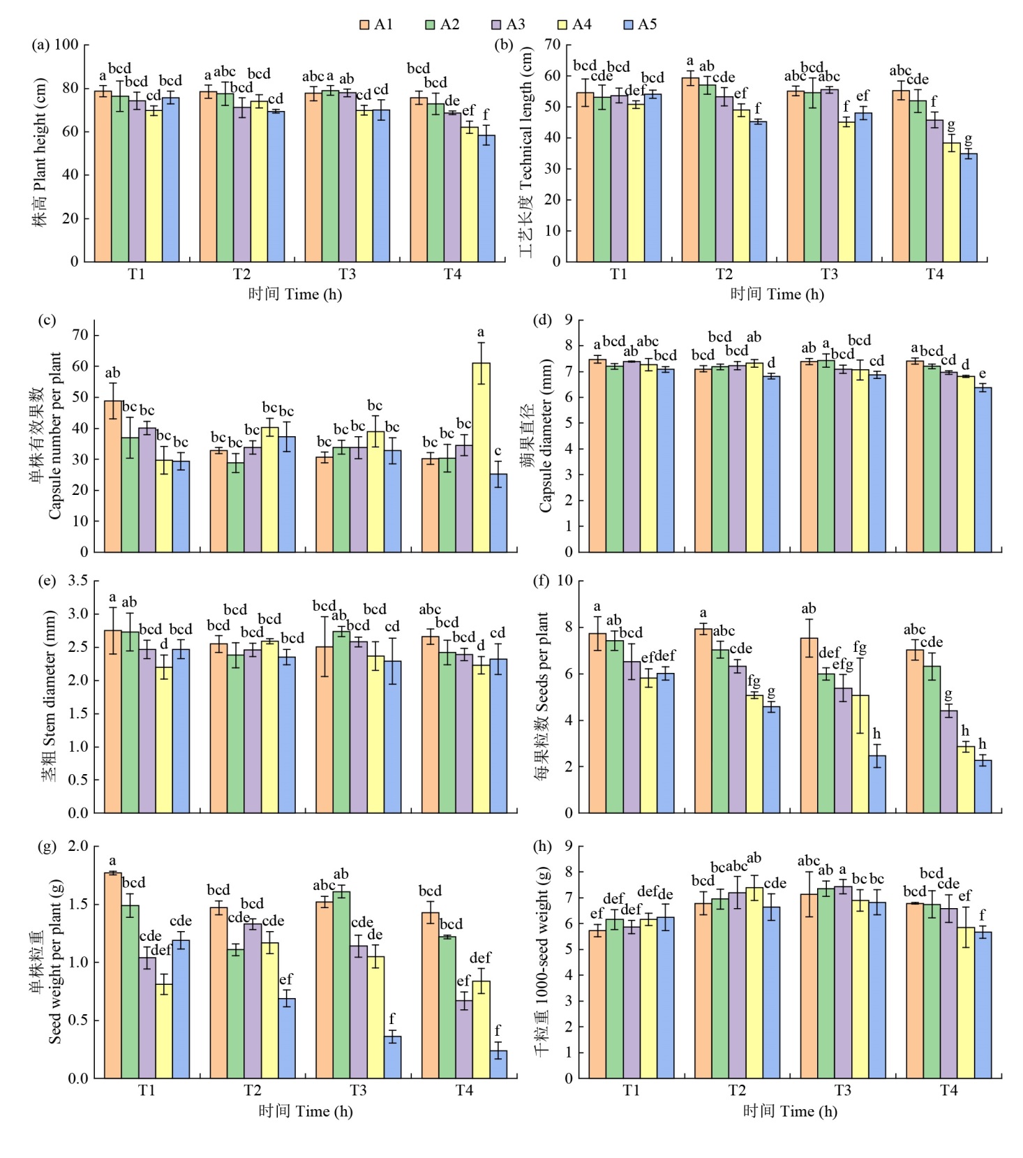 摘要: 为了进一步提高胡麻种子发芽率,改善农艺性状,选育出含油率和亚麻酸等含量较高,且更适宜不同生态环境的优异种质。试验分析了2种化学诱变剂(EMS和NaN3)的浓度和浸种时间对胡麻种子发芽率、发芽势、相对致死率及M1代主要农艺性状的影响。结果表明,化学诱变剂显著抑制胡麻种子萌发,降低发芽势和发芽率,影响M1代主要农艺性状。EMS诱变剂最优的半致死剂量为1.40%/12 h,种子的致死率为51.89%,NaN3诱变剂最优的半致死剂量为4.0%/16 h和8.0%/8 h,种子的半致死率为54.69%和48.09%。不同化学诱变剂对M1代主要农艺性状的影响随浸种时间和浓度的变化而不同。EMS处理下,除蒴果直径随浓度增大及浸种时间延长变异系数降低外,其余各指标的变异程度总体随EMS浓度升高及处理时间延长而逐渐增大。NaN3处理下,除单株粒重和单株有效果数外,其余各指标的变异程度在一定浓度(时间)随浸种时间(浓度)增大而逐渐增加。本研究筛选出了适宜浓度×时间互作的相对致死处理和M1花色、株型以及子叶性状发生诱变的材料,同时为胡麻化学诱变育种提供了基础研究数据。