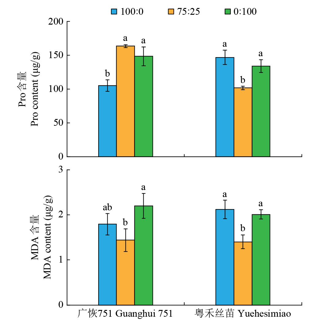 摘要: 以水稻品种“广恢751”和“粤禾丝苗”为试验材料,设置不同铵硝混配营养(100:0、75:25、0:100)处理,分析在高温胁迫条件下(白天平均温度在40~45 ℃,夜晚平均温度在30~35 ℃)不同铵硝混配营养对水稻生物量、根系形态、脯氨酸(Pro)、丙二醛(MDA)以及抗氧化酶活性的影响。结果表明,高温胁迫下,75:25处理的水稻生物量最大,与100:0和0:100处理相比,水稻地上部生物量分别增加了9.94%~16.59%和22.01%~23.98%。水稻的总根长、根表面积和根体积均随着硝态氮的增加而增加,但根直径无显著差异。与100:0处理相比,75:25处理广恢751叶片的过氧化氢酶(CAT)、过氧化物酶(POD)和抗坏血酸过氧化物酶(APX)活性分别增加了250.00%、61.42%和207.00%,Pro含量增加了55.67%。粤禾丝苗叶片的CAT和APX活性显著增加,MDA含量下降了33.84%。上述结果表明,75:25的铵硝混配营养缓解了水稻的高温胁迫,铵硝混配营养主要通过诱导抗氧化酶活性影响Pro或MDA含量,从而缓解水稻的高温胁迫。