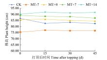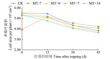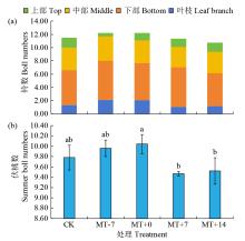摘要: 探索机械打顶时间对棉花农艺性状和产量的影响,明确冀南棉区棉花机械打顶的可行性及打顶时间。于2022-2023年,以黄河流域大面积种植的‘冀863’为试验材料,设置人工打顶和机械打顶2个因素,人工打顶时间为7月15日(CK),机械打顶时间分别为7月8日(MT-7)、7月15日(MT+0)、7月22日(MT+7)、7月29日(MT+14),共5个处理,测定株高、叶面积、果枝长度、棉铃分布、吐絮率和产量等指标。结果表明,机械打顶各处理与CK一样,可以有效控制棉花株高和叶面积,棉花株高随着打顶时间推迟而增加。棉花果枝数随着机械打顶时间的推迟而增加,MT-7处理果枝数比CK显著降低24.24%。与CK相比,各机械打顶处理没有显著影响棉花上部果枝的平均长度;机械打顶处理的上部果枝平均长度随打顶时间的推迟而降低,MT-7处理上部果枝平均长度比MT+7、MT+14处理分别显著增加30.17%和32.01%。机械打顶影响棉铃在果枝上的分布,与CK相比,MT-7、MT+0、MT+7处理叶枝和下部果枝总铃数和百分比增加,上部果枝的铃数和百分比降低。MT+7和MT+14处理的伏桃数比MT+0处理分别显著下降5.71%和5.18%。机械打顶可增加棉花的吐絮率。与CK相比,2022年MT-7处理的单株铃数和籽棉产量显著下降,2023年MT+14处理的单株铃数和籽棉产量显著下降。综上,冀南棉区棉花机械打顶可行,打顶时间为当地人工打顶同期至推迟7 d,大致在7月15日-7月22日。