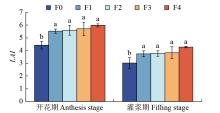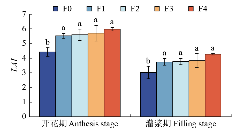 摘要: 本研究分析了不同尿素类型及施用方式对滴灌冬小麦生长及产量的影响,为新疆滴灌冬小麦尿素合理施用提供理论依据。于2021-2022年在大田滴灌条件下,以小麦品种新冬18号为材料,设置不施尿素(F0)、普通尿素(F1)、腐植酸尿素(F2)、控释尿素一次基施(F3)和控释尿素分次施用(F4)共5个处理,除F0外,每个处理纯氮用量均为225 kg/hm2,研究不同处理对滴灌冬小麦株型性状、叶面积指数(LAI)、光合势(LAD)、干物质转运及籽粒产量的影响。结果表明,F1处理相较于F0处理,在测定期可提高滴灌冬小麦的株高、穗长、穗下节和倒二节节间长度;其余尿素处理的株高和各节间长度较F1处理均降低,但穗长则相对增长,其中F4处理表现为株高最短,穗最长。各处理在开花期和灌浆期的LAI均表现为F4>F3>F1>F2>F0,LAD变化规律与LAI相同;控释尿素分次施用可有效促进小麦花后干物质生产并向籽粒运转;不同处理滴灌冬小麦产量以F4处理最高,为9210.95 kg/hm2,分别较F0、F1、F2和F3处理提高了21.64%、12.52%、8.12%和6.52%。综合分析得出,在本试验条件下,控释尿素分次施用(F4)处理下冬小麦株型性状相对较好,LAI最大,干物质积累转运效率和对籽粒贡献率较高,籽粒增产幅度较大。