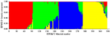 为了解亚麻种质资源遗传背景,选育优质亚麻新品种,利用表型性状和分子标记(SSR)对387份亚麻种质资源的9个农艺性状及6个品质性状进行遗传多样性分析、聚类分析、主成分分析以及群体结构分析。农艺性状遗传多样性指数为0.70~2.08,变异系数在5.55%~129.18%。品质性状遗传多样性指数在1.83~2.08,变异系数在0.07%~1.38%。试验共扩增出320个SSR位点,平均每对引物11.81个;有效等位基因数为1.1991~1.8230,引物PIC为0.2489~0.6257;在遗传相似系数为0.66处可以将387份亚麻种质资源分为5个类群,农艺性状以及品质聚类分析同样各分为5个类群。
