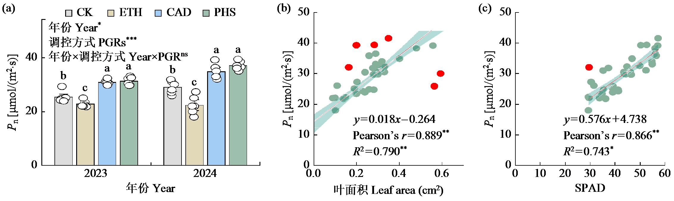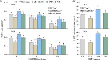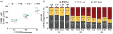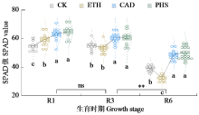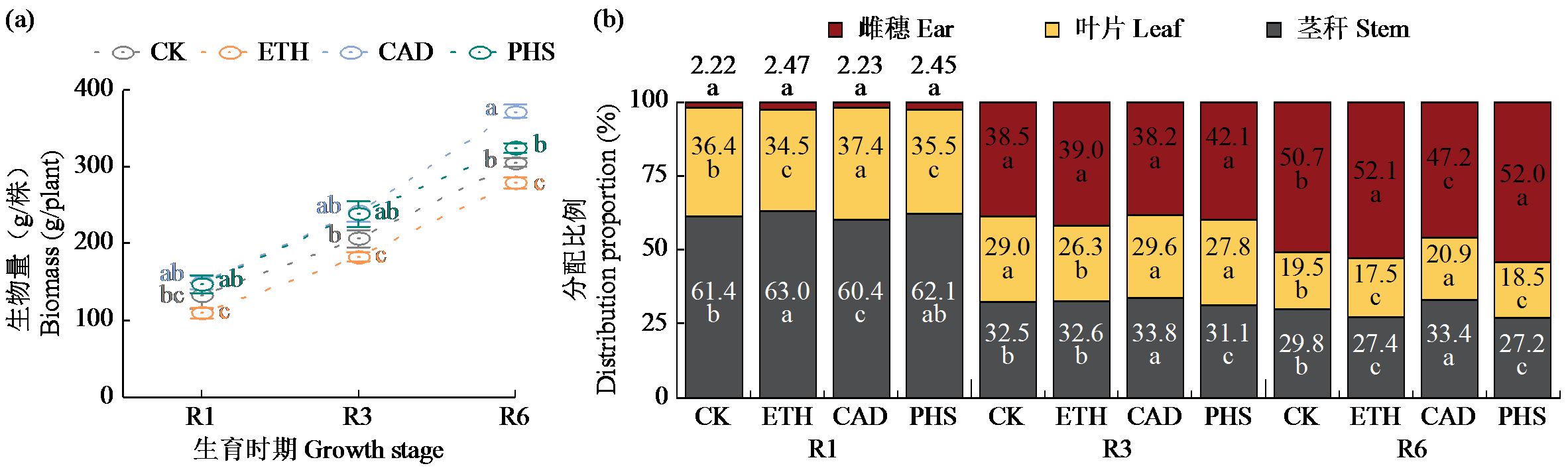 增加种植密度提高了玉米(Zea mays L.)产量,但加剧了倒伏风险;喷施乙烯利可增强玉米倒伏抗性,却对产量存在不利影响。为进一步提高产量,于2023-2024年,以郑单958为材料,设置清水(CK)、乙烯利(ETH)、增效剂(胺鲜酯+二氢卟吩铁,CAD)和组合化控(PHS)4种调控方式,测定光合特性、干物质积累与分配及产量相关指标,探索了新型调节剂二氢卟吩铁复配增效剂与乙烯利配施对玉米光合性能和产量的影响。结果表明,与CK处理相比,ETH处理下玉米的光合势、净光合速率(Pn)和成熟期干物质积累量分别下降25.70%、13.93%和8.54%,穗粒数下降9.00%,千粒重没有明显变化,最终导致产量下降11.07%;CAD处理提高了玉米的叶面积和相对叶绿素含量(SPAD值),Pn提高17.97%,进而提高了成熟期干物质积累量,且干物质向茎秆和叶片中的分配比例分别增加了3.55%和1.43%,最终促使产量提高7.81%;PHS处理有效缓解了乙烯利对叶面积和光合势的负面影响,成熟期SPAD值提高26.55%,延缓了植株衰老进程,Pn提高23.53%,干物质积累量和收获指数同样提高,促使产量提升7.76%。综上所述,乙烯利配施增效剂可通过提高玉米叶面积和SPAD值改善光合性能,进而提高干物质积累量和收获指数,缓解了传统抗倒伏调控方案对产量的负面影响。
