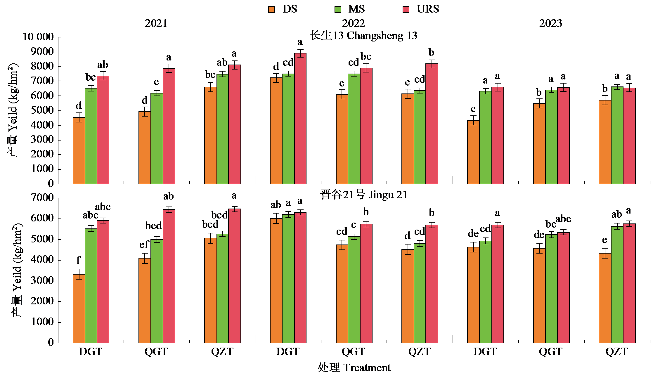 不同收获时间和方式对谷子产量的影响 不同小写字母表示在P < 0.05水平上差异显著,下同。