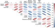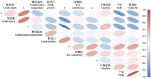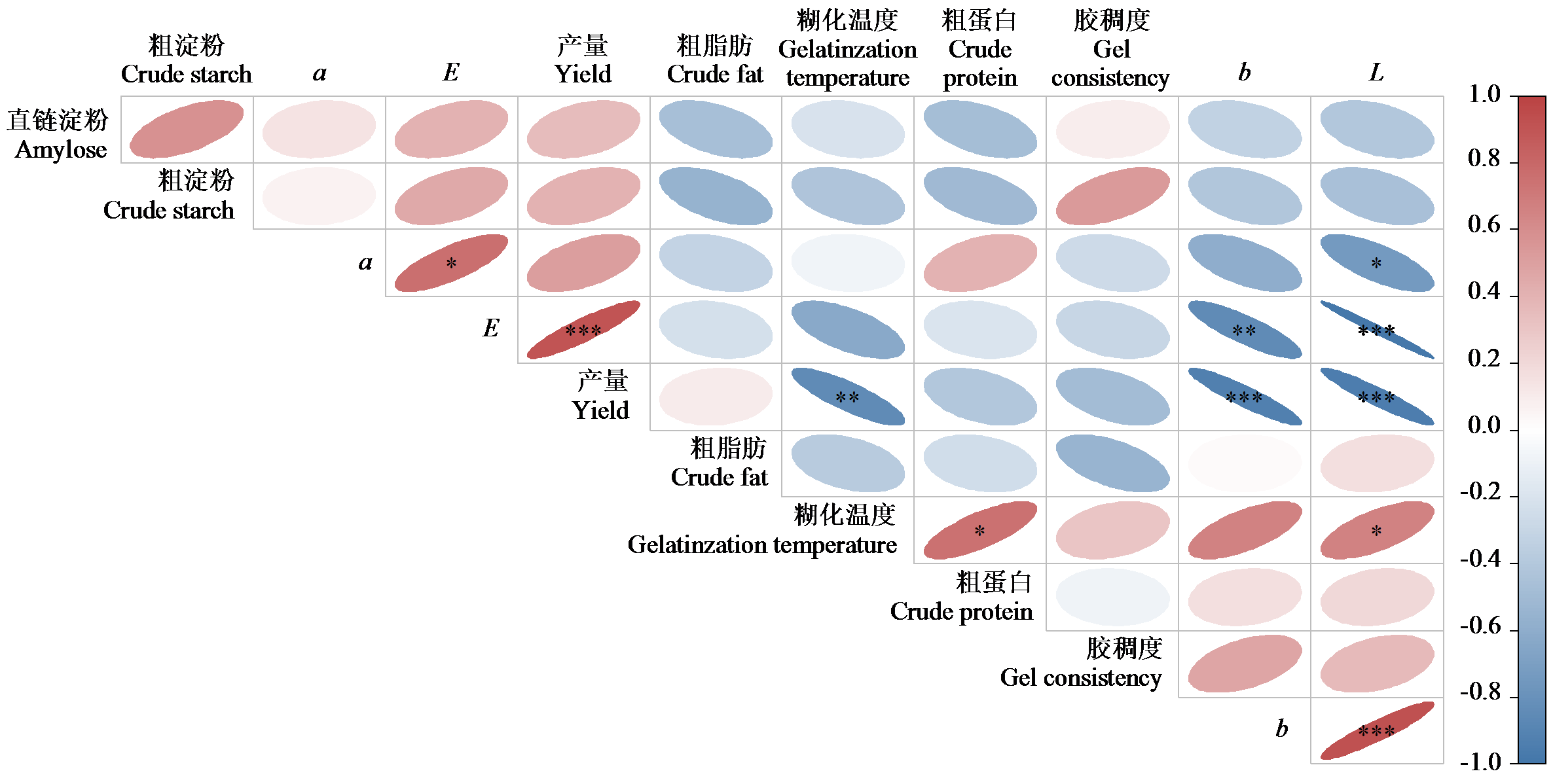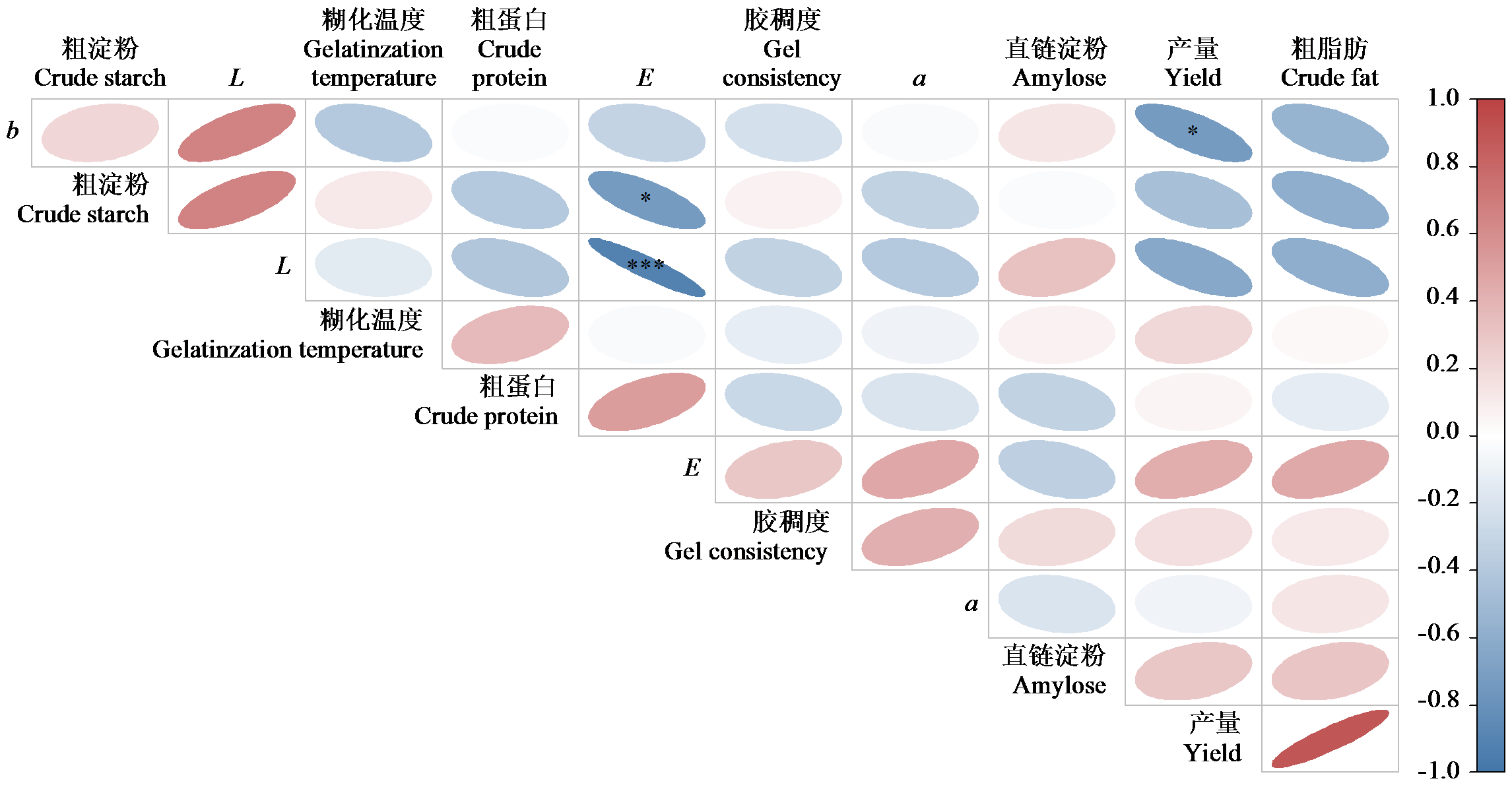 长生13产量与品质相关关系 “*”、“**”和“***”分别表示P < 0.05和P < 0.01和P < 0.001水平显著相关。下同。