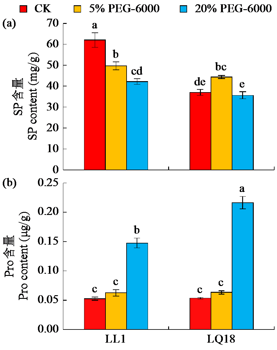 为研究抗旱性藜麦幼苗对干旱胁迫的响应,选取强抗旱型藜麦品种陇藜1号(LL1)和新育品系LQ18作为试验材料,利用聚乙二醇6000(PEG-6000)溶液模拟干旱环境,设置正常灌水(CK)、轻度干旱胁迫(5% PEG-6000)和重度干旱胁迫(20% PEG-6000)3个处理,考察了藜麦种子的发芽率、发芽势和发芽指数,幼苗株高、叶面积和根长,地上及地下部干重,可溶性蛋白和脯氨酸含量,超氧化物歧化酶(SOD)和过氧化物酶(POD)活性及丙二醛(MDA)含量。结果表明,重度干旱胁迫降低了2个品种(系)的株高、叶面积和地上部干重,但提高了根长、地下部干重和根冠比。其中,LQ18的叶面积和地上部干重降幅,以及根长、地下部干重和根冠比增幅均小于LL1。干旱胁迫下LL1的可溶性蛋白含量逐渐降低,但LQ18的可溶性蛋白含量先升高后降低直至与CK无显著差异。重度干旱胁迫下2个品种(系)的脯氨酸含量均显著升高,且LQ18的脯氨酸含量显著高于LL1。干旱胁迫影响了2个品种(系)的SOD、POD活性并提高了MDA含量,重度干旱胁迫下LQ18的SOD活性略有下降,但其POD活性显著提高,且MDA含量显著低于LL1。