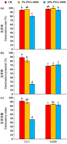 干旱胁迫对2个品种(系)藜麦发芽率、发芽势和发芽指数的影响 不同小写字母表示在P < 0.05水平差异显著,下同。
