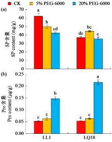 干旱胁迫对2个品种(系)藜麦幼苗SP和Pro含量的影响