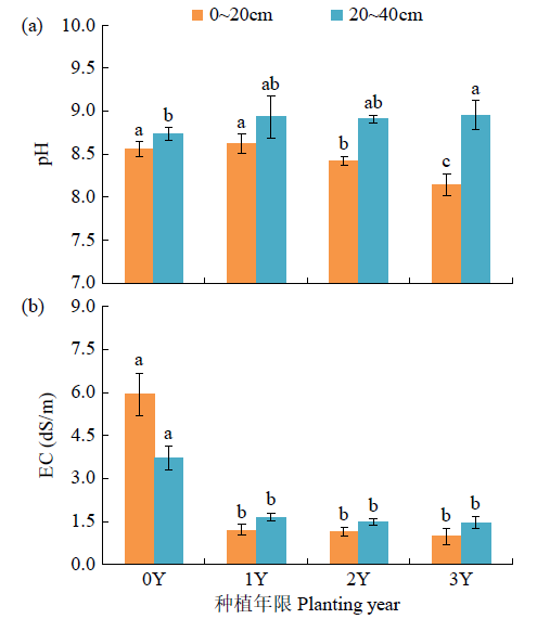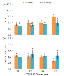 为探明滩涂水产养殖复垦区种稻短期内土壤特性变化及水稻产量表现,选择复垦区荒地(0Y)作为对照,设置种稻1年(1Y)、2年(2Y)和3年(3Y)处理田块。结果表明,与0Y田块相比,种稻后在0~20cm土层中,电导率(EC)、pH、孔隙度、NH4+、NO3?、速效钾和土壤水溶性有机碳(WSOC)/土壤有机碳(SOC)均有降低趋势,容重、SOC、总氮、WSOC和C/N均有增加趋势;在20~40cm土层中,EC、NH4+、NO3?、SOC、总氮、WSOC、WSOC/SOC和C/N均与在0~20cm中有相似的变化趋势。随种植年限增加,0~20cm土层中,SOC、WSOC、有效磷和C/N均有增加趋势,速效钾和WSOC/SOC均有降低趋势;同时,1Y、2Y和3Y田块SOC含量相比0Y田块分别提高了32.18%、34.67%和111.03%,WSOC含量相比0Y分别提高了15.90%、11.82%和