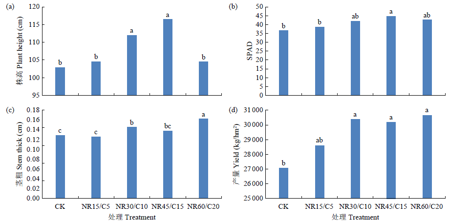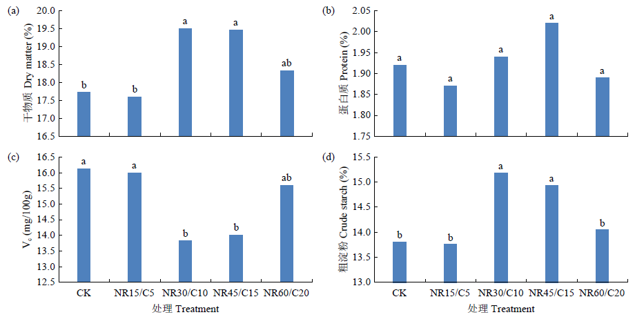 化肥减施和有机肥替代化肥是现阶段绿色优质栽培的重要农业措施。以当地传统施肥为对照,设置NR15/C5(无机氮减量15%+有机氮替代补偿5%)、NR30/C10(无机氮减量30%+有机氮替代补偿10%)、NR45/C15(无机氮减量45%+有机氮替代补偿15%)、NR60/C20(无机氮减量/60%+有机氮替代补偿20%)4个减氮替代处理,研究有机肥替代部分氮肥对土壤容重、盐度、养分、酶活性以及马铃薯生长、品质的影响。结果表明,随着有机肥替代氮肥量的增加,马铃薯株高、产量、干物质含量和相对叶绿素含量总体较对照增加,呈先增大后减小趋势,NR45/C15较对照增量达显著水平;马铃薯茎粗、蛋白质、有机质、酸性蛋白酶和碱性磷酸酶活性增加,土壤全磷和有效磷含量增大,NR45/C15和NR60/C20处理较对照均显著提高;土壤pH、盐度、全氮和碱解氮含量减少。说明在有机肥替代部分氮肥模式中2种不同形态氮素通过消解与吸收方式形成优劣互补和供肥平衡,提高了马铃薯对肥料的利用效率,改善了土壤结构,促进了马铃薯生长和干物质积累。