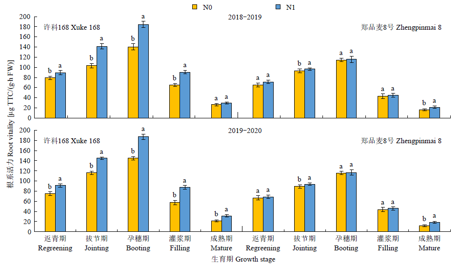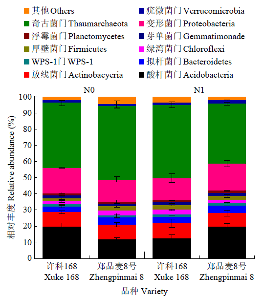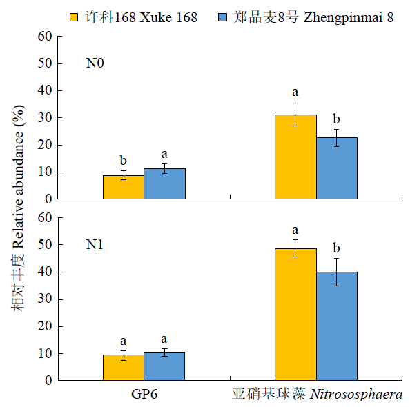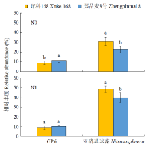 为探明不同氮效率小麦品种的微生物学特性差异,于2018-2020年开展大田试验,研究0(N0)和165kg/hm2(N1)2个施氮水平处理下,氮高效品种“许科168”和氮低效品种“郑品麦8号”的根系活力、根际土壤酶活性和微生物群落多样性的差异。结果表明,随生育进程推进小麦根系活力表现为先增加后降低,孕穗期根系活力最强。在孕穗期,与郑品麦8号相比,许科168的根系活力、β-葡萄糖苷酶、亮氨酸氨基肽酶和多酚氧化酶活性在N0和N1处理下均增加。N0处理下,许科168的细菌群落丰富度指数和多样性指数大部分显著高于郑品麦8号,N1处理下2个品种差异不显著。同一处理,2个品种的优势门丰度也有一定差别,N0处理下,许科168的酸酐菌门和奇古菌门均高于郑品麦8号;N1处理下,许科168的酸酐菌门比郑品麦8号降低了37.23%,奇古菌门则增加了13.30%;GP6属和亚硝基球藻属为优势属,其中许科168的亚硝基球藻属在2种氮水平下均明显高于郑品麦8号。总之,氮高效小麦品种许科168在N0和N1处理下均具有较高的根系活力和根际土壤酶活性;在N0处理下具有较高的丰富度指数和多样性指数,这都可能引起根际微环境的变化,也可能因为栽培措施(施氮)不同而有所改变。本研究可以为当地适宜小麦品种筛选和适当施肥提供参考。