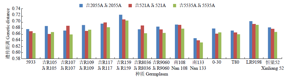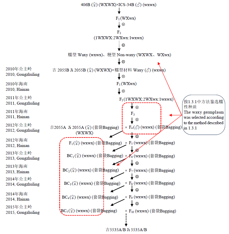 为选育适合春播早熟区种植的抗病性强、品质优良的糯高粱不育系,以配合力高、抗病性强、品质优良的粳高粱骨干保持系吉2055B为母本,以406B和糯性保持系ICS-34B杂交后代的矮秆糯质中间材料为糯质供体,利用5年时间经过1代杂交、10代自交和5代回交转育培育出品质优良、抗病性强的优异糯质不育系吉5535A。吉5535A籽粒品质优良,含支链淀粉99.17%、粗蛋白14.29%、粗脂肪3.15%、单宁0.01%、赖氨酸0.33%,千粒重达27.2g。其抗病性强,高抗高粱丝黑穗病、抗炭疽病、抗靶斑病、中抗茎基腐病。由分子标记分析可得,吉5535A的Waxy基因等位突变属于wxb类型突变。吉5535A与低单宁恢复系可组配出优质饲用、食用高粱杂交种,与高单宁恢复系又可组配出优质酿酒高粱杂交种,是培育酿造专用、籽粒饲用、食用杂交种的优良不育系。吉5535A拓宽了糯质不育系的遗传基础,为我国高粱不育系改良提供了优异种质,提升了春播早熟区糯高粱杂交种的产量和品质,促进了本生态区酿酒、籽粒饲用和食用杂交种的培育。