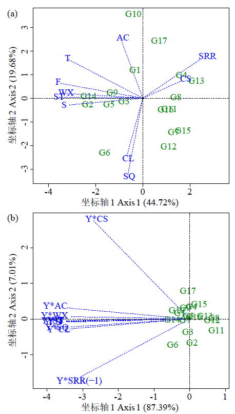 品种与品质性状(a)及品种与产量×品质性状(b)的双标图 SRR:皮渣率;AC:支链淀粉含量;CS:粗淀粉含量;SQ:感官品质;F:风味;CL:色泽;S:气味;WX:糯性;T:柔嫩性;ST:皮厚度;Y:产量,下同