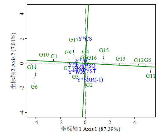 品种高产稳产性功能的GGE双标图