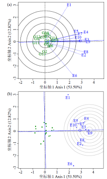 GGE双标图的试点功能形态分析图 (a) 试点区分力和代表性功能图,(b) 试点理想环境排序功能图