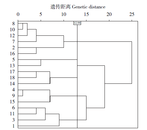 小麦是世界上主要粮食作物之一,也是我国的主要粮食作物。1950年以来,我国小麦育种大致经历了抗病稳产、矮化高产和高产优质3个阶段[1]。其中,矮秆基因的利用是小麦产量潜力提高的主要原因[2]。但是,小麦产量为数量性状,是多个农艺性状共同作用的结果,受多基因控制和环境因素的影响,而且不同性状间相互联系又相互制约,某一性状的改变会导致其他性状发生改变[3]。目前,提高小麦产量的阻碍是单位面积有效穗数、穗粒数、千粒重间存在的负效应,所以协调产量的构成因素是小麦高产育种的基本思路[4]。然而,由于小麦育种亲本材料的遗传基础普遍狭窄,育种过程中缺乏综合的、定量的统计分析,易受主观因素影响,导致我国小麦的产量水平难以取得突破性进展[5,6]。为了提高育种选择效率,有必要对不同性状间的相互关系及品种间的遗传多样性进行分析。为此,本试验通过对近年选育出的18个高代小麦品系的农艺性状进行变异性分析和相关性分析,并依据其表型性状进行聚类分析,以期为小麦育种提供科学依据。