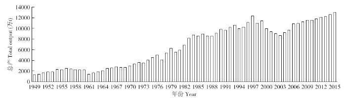 从小麦历年总产的变化分析(图7),总产受种植面积和单产2个因素影响。种植面积和单产同时增加时,总产提高的幅度更大,其中一个因素明显减少时,对总产会有较大影响;2个因素都减少,总产受到明显影响。总体分析,从1949年到1960年小麦总产缓慢上升,1961年面积略有减少,但是单产降到了历史最低点,导致总产出现一个低谷。此后,总产基本呈现稳步增加的趋势,直到1997年总产出现一个峰值,此后由于种植面积逐渐减少,即使单产有所增加,但由于种植面积减少较大,致使2004年总产再次出现明显低谷。其后国家对种植结构再次调整,逐渐恢复小麦种植面积,单产也出现持续增加的势头,使小麦总产出现持续增加的趋势。纵观我国小麦生产的发展,在种植面积基本稳定的条件下,总产的提高更主要取决于单产的增加,2015年在小麦面积比1949年增加12.20%的情况下,总产增加8.43倍,说明单产的提高对总产的贡献更大[6,7,8]。