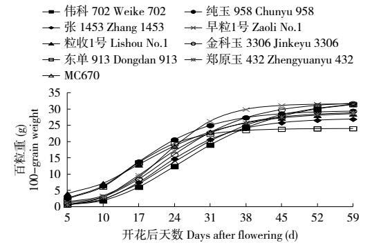 2.3 不同玉米品种百粒重变化动态