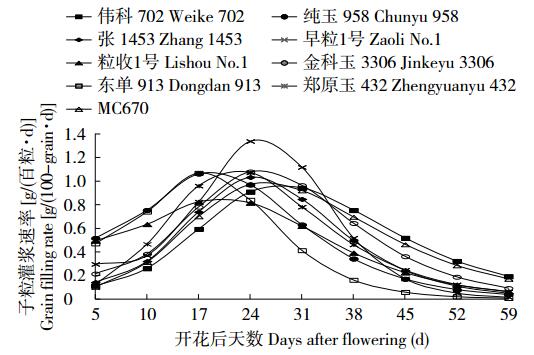 | 图2 玉米子粒灌浆速率的动态变化 |