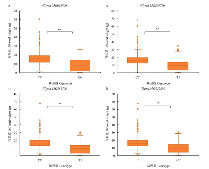 利用文献检索得到的59个在拟南芥和水稻中已明确生物学功能的与籽粒大小/粒重相关的基因,经过同源分析,在大豆基因组中鉴定到175个同源基因。对基因的表达谱进行分析,发现有22个基因在大豆的种子中特异性表达。利用56份大豆种质资源的重测序数据鉴定出121个SNP位点在野生大豆和栽培大豆间存在分化,其中16个SNP为非同义变异位点,分布于11个基因中。通过扩增测序验证这些非同义变异位点,结合1695份有百粒重表型的资源的重测序数据分析,发现有4个SNP在野生型和突变型所对应的百粒重表型间存在极显著差异,并且野生型变异材料的百粒重≥12g,而突变型变异材料的百粒重<12g。这4个SNP分别位于Glyma.05G019800、Glyma.07G022800、Glyma.13G259700和Glyma.13G261700这4个大豆基因中,可作为大豆百粒重候选基因,为后续相关的基因功能研究奠定基础。