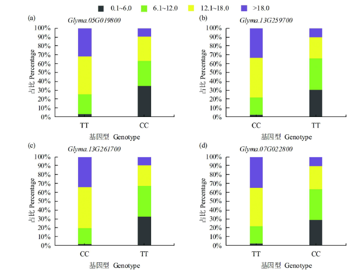进一步按照0.1~6.0g、6.1~12.0g、12.1~18.0g及>18.0g的分布范围来划分百粒重数据,统计4个SNP不同变异类型的材料中,不同百粒重范围的资源数量占总资源数量的比例。结果(图4)表明,在每个SNP中携带野生型变异的大豆资源百粒重≥12.0g的材料占总材料比例超过60%,而在每个SNP中携带突变型变异的大豆资源百粒重<12.0g的材料占总材料的比例也超过了60%。因此,这4个SNP所在的候选基因Glyma.05G019800、Glyma.07G022800、Glyma.13G259700和Glyma.13G261700可能都与籽粒大小/粒重的调控有关。
