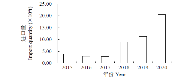 1.2.2 进口情况 受国内外绿豆市场价格及国内绿豆市场需求的影响,自21世纪初我国开始进口绿豆,近年来进口量逐年增加。据统计,2015-2020年我国绿豆进口量在3.79万~20.53万t之间(图3)。其中,2020年进口量最多,达到20.53万t。