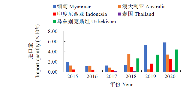 The major import countries and quantity of mungbean from 2015 to 2020 in China
