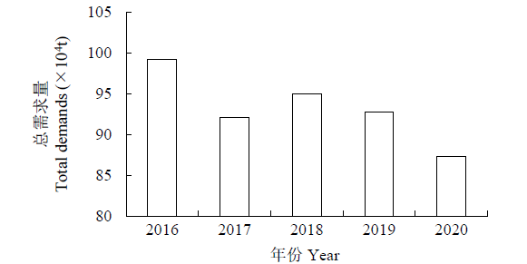 据国家食用豆产业技术体系和山东卓创咨讯股份有限公司调研,我国绿豆作为原粮,经过简单加工后,约有75%用在国内消费,约25%用作出口。2016-2020年我国绿豆总需求量在87.32万~99.23万t之间(图5),呈先增后减的趋势。我国绿豆消费方式有直接食用和加工食用。直接食用主要是通过国内批发市场到超市或小摊贩,最终流向消费者。加工消费可根据其利用绿豆原料中的主要成分分为5种类型,淀粉类加工产品包括绿豆淀粉、绿豆粉丝、绿豆粉皮、绿豆凉粉、绿豆沙等;蛋白类加工产品包括绿豆奶、绿豆蛋白粉等;全营养加工产品包括绿豆糕、绿豆饼干;营养优化型加工产品包括绿豆芽、罐头和春卷等;利用绿豆可溶物制作的固体和液体饮品,如绿豆凉茶等。其中,绿豆芽、绿豆粉丝等是主要的绿豆加工产品。绿豆作为传统消暑食品,每年需求量较大,同时芽菜、甜品需求也有一定比例,但随着食品安全、大气污染治理以及夏季消暑食品的增多,绿豆总体需求呈下降趋势[28,29]。