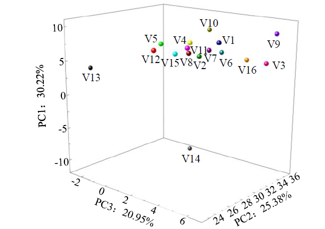 | 图4 16个谷子品种米色和小米品质的主成分图 |