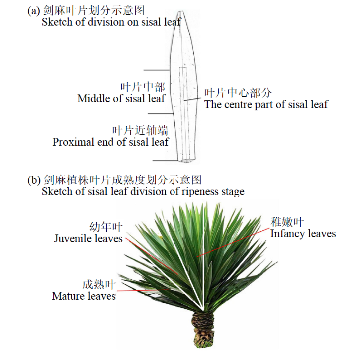剑麻H.11648取自广西壮族自治区亚热带作物研究所南宁剑麻试验站剑麻种植示范基地。选取定植苗(大田定植1年的剑麻种苗)和3刀麻(开割3年的剑麻)的叶片为研究对象[8]。