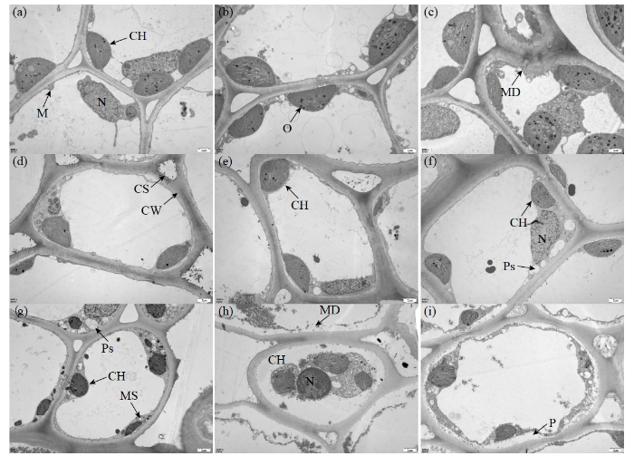 a-c:成熟叶近轴端,d-f:幼年叶近轴端,g-i:稚嫩叶近轴端,CH:叶绿体,O:嗜锇颗粒,Ps:空泡,MS:线粒体肿胀,P:质壁分离;Bar=2μm,加速电压= 80kV