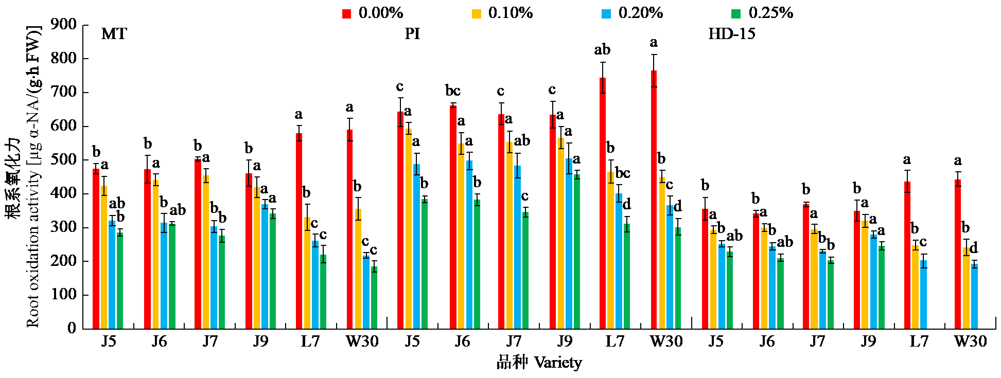 | Fig.1 Effects of salt stress on root oxidation activity of rice during main growth periods J5: Lianjian 5, J6: Lianjian 6, J7: Lianjian 7, J9: Lianjian 9, L7: Lianjing 7, W30: Wuyunjing 30. Different lowercase letters indicate significant difference between same treatments of different varieties (P < 0.05). The same below |