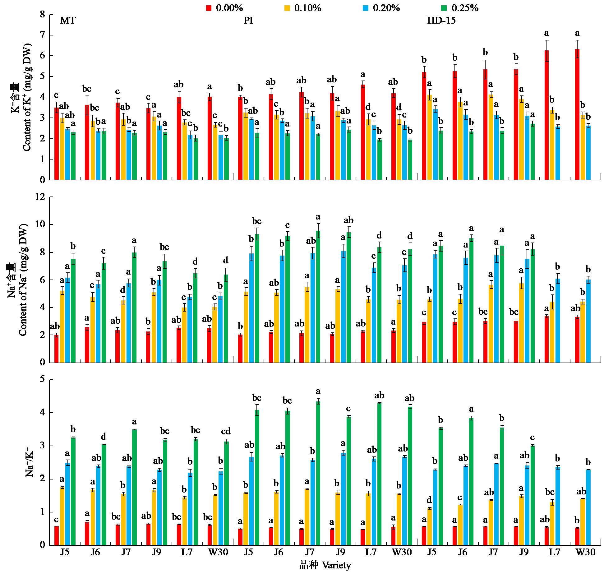 | 图5 盐胁迫对水稻主要生育时期根系Na+、K+含量和Na+/K+的影响 |