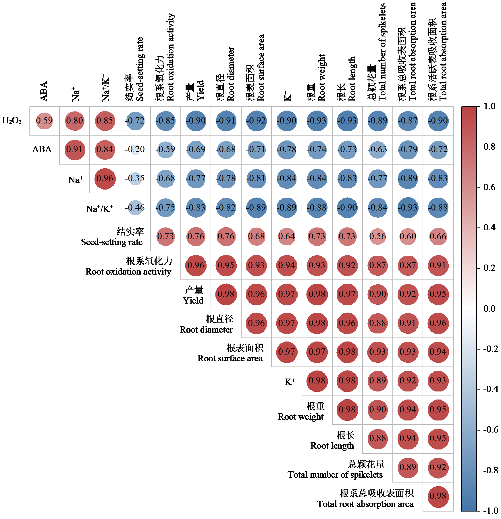 | 图6 抽穗后15d水稻根系性状与产量及其构成因素的相关性分析 |