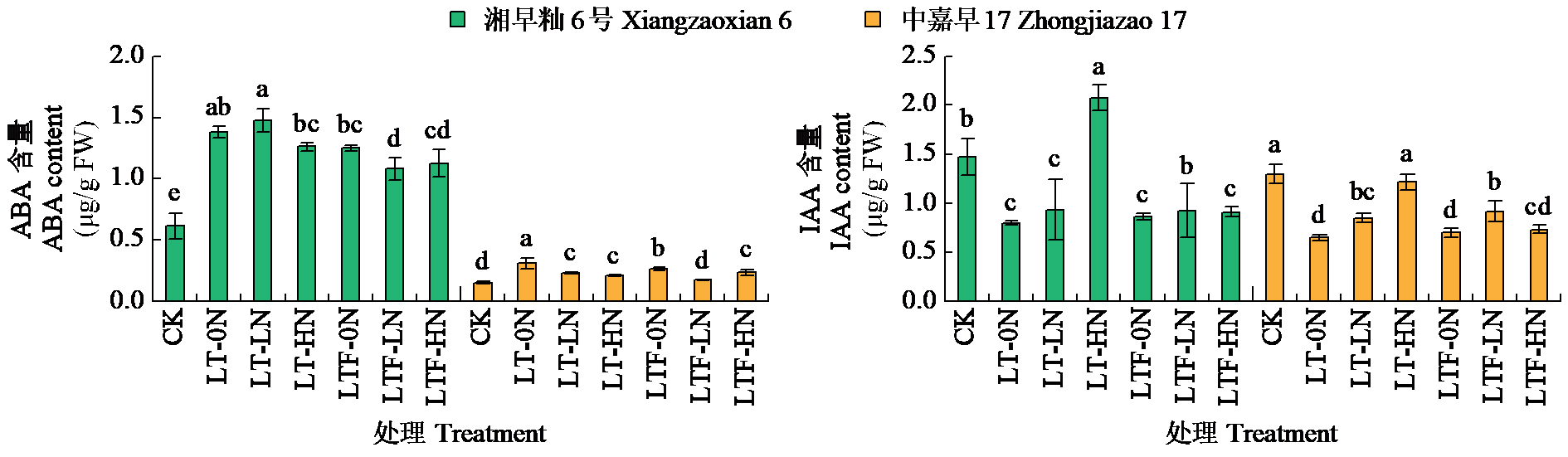 | 图5 水氮耦合对直播早籼稻苗期低温冷害内源激素含量的影响 |