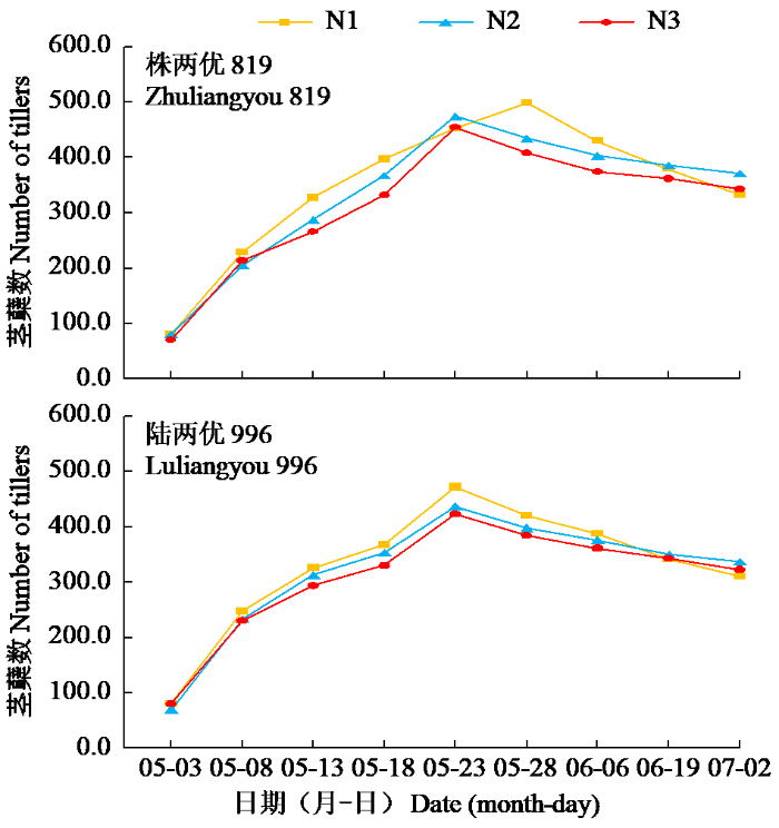 由图1可以看出,2个早稻品种均于5月3日进入快速分蘖期,除株两优819的N1处理于5月28日达到最高茎蘖数外,其他处理均于5月23日达到最高茎蘖数。株两优819和陆两优996最高茎蘖数均以N1处理最多,分别为499.0和472.3,N2处理次之,N3处理最少。最高茎蘖数后,茎蘖数迅速下降,至成熟期,株两优819和陆两优996均以N2处理下降幅度最小,成穗率最高,分别为74.0%和69.8%。