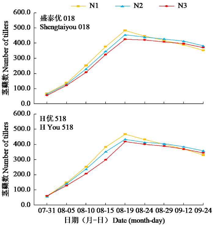 由图2可知,与早稻一致,晚稻品种盛泰优018和H优518的最高茎蘖数也均表现为N1>N2>N3趋势,N1处理分别为483.0和467.7,N2处理分别为455.0和434.8,N3处理分别为426.3和418.9;而最终盛泰优018和H优518的成穗率均以N2处理的最高,分别为72.5%和76.9%。