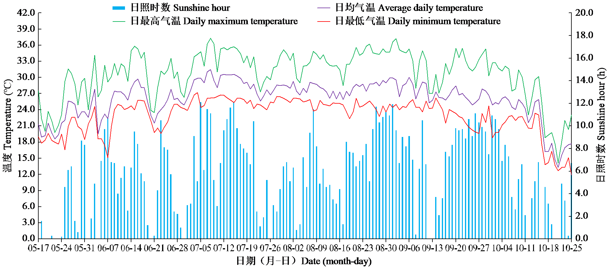 | 图1 2021年水稻生长季节内的气温和日照时数变化 |
