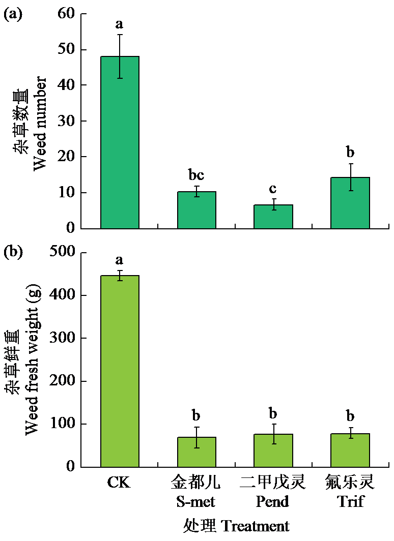 | 图3 播前7d除草剂对杂草数量和质量的影响 |