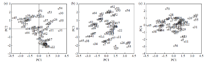 对70份大麦种质资源的10个农艺性状进行主成分分析,结果如表4所示,前4个主成分所构成的信息量占总信息量的83.83%,能够概括全部性状的大部分生物学信息。第一主成分的贡献率为35.96%,其中载荷较高且为正值的有株高、第二茎节长、第一茎节长,为负值的有单株穗数,可将其生物学信息概括为株高―分蘖因子,株高过高容易造成倒伏,所以第一成分应偏小为好。第二主成分的贡献率为20.34%,其中载荷较高且为正值的农艺性状有第一茎节长、第二茎节长,为负值的有穗下茎节长,可将其生物学信息概括为株型性状因子,第一茎节长、第二茎节长的增大不利于主穗粒数的增加,第二主成分不宜过高或过低。第三主成分的贡献率为19.45%,其中载荷较高的农艺性状有单穗粒重和主穗粒数,且均为正值,可将其生物学信息概括为穗部性状因子,单穗粒重和主穗粒数的增大有利于产量增加,所以第三主成分应适当偏大。第四主成分的贡献率为8.07%,其中载荷较高的农艺性状有穗下茎节长和千粒重,可将其生物学信息概括为粒重―穗部性状因子,穗长与千粒重呈不显著负相关,且植株过高易造成倒伏,所以第四主成分不宜过高或过低。