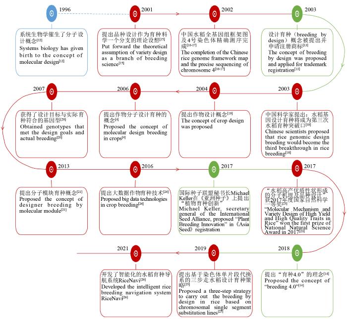 国内最早于2001年提出设计育种的雏形,陈绍江[15]提出了品种设计作为育种科学一个分支的理论设想;2002年,我国水稻全基因组框架图以及第4号染色体精确测序的完成,标志着我国在水稻基因组研究中处于世界领先的地位[16-17];2003年,在中国水稻研究所组织的“利用生物技术开发水稻育种新材料”国际水稻育种峰会上,与会者提出“水稻基因设计育种将成为第三次水稻育种突破口”的新观点[18];2004年,提出了“作物设计”的育种新概念[19];2006年,万建民[4]提出了作物分子设计育种的概念;2007年,钱前[20]利用日本晴和9311重组自交系定位的6个分蘖QTL和其他8个已经定位的分蘖基因构建了14个分蘖基因/QTL导入系和染色体单片段置换系,获得了设计目标与实际育种符合的基因型;2013年,薛勇彪等[21]提出了针对农业生物复杂性状改良的“分子模块育种”概念;余泓等[22]率先在我国开展分子设计育种研究,研究成果“水稻高产优质性状形成的分子机理及品种设计”荣获2017年度国家自然科学一等奖[23];2016年,樊龙江等[24]提出了大数据作物育种技术;2019年,张桂全[25]提出了基于染色体单片段代换系(single-segment substitution lines,SSSL)的三步走水稻设计育种策略;2021年,Wei等[26]构建了迄今为止最完善的水稻数量性状基因关键变异(causative variation)图谱,开发了一款智能化的水稻育种导航系统RiceNavi®(图1)。无论是国内还是国外,还是多种形式的命名,设计育种的核心是结合多学科交叉实现的新型育种方式,是在整合创新链上各要素而形成的高效精准育种技术体系,也是未来作物育种的不二选择(表1)。当前,世界主要发达国家都在积极部署面向未来作物的基础研究,设计育种进入战略性竞争阶段[11]。目前,我国作物设计育种研究与世界整体在一个发展水平,甚至已经引领水稻乃至作物生物学、遗传学和基因组学基础研究[17],具备率先实现作物设计育种的生物学基础条件。与此同时,我国科学家将水稻功能基因组学中所获得的基础理论研究成果与实际应用紧密结合,率先在作物育种工作中实践分子设计育种的理念[27]。