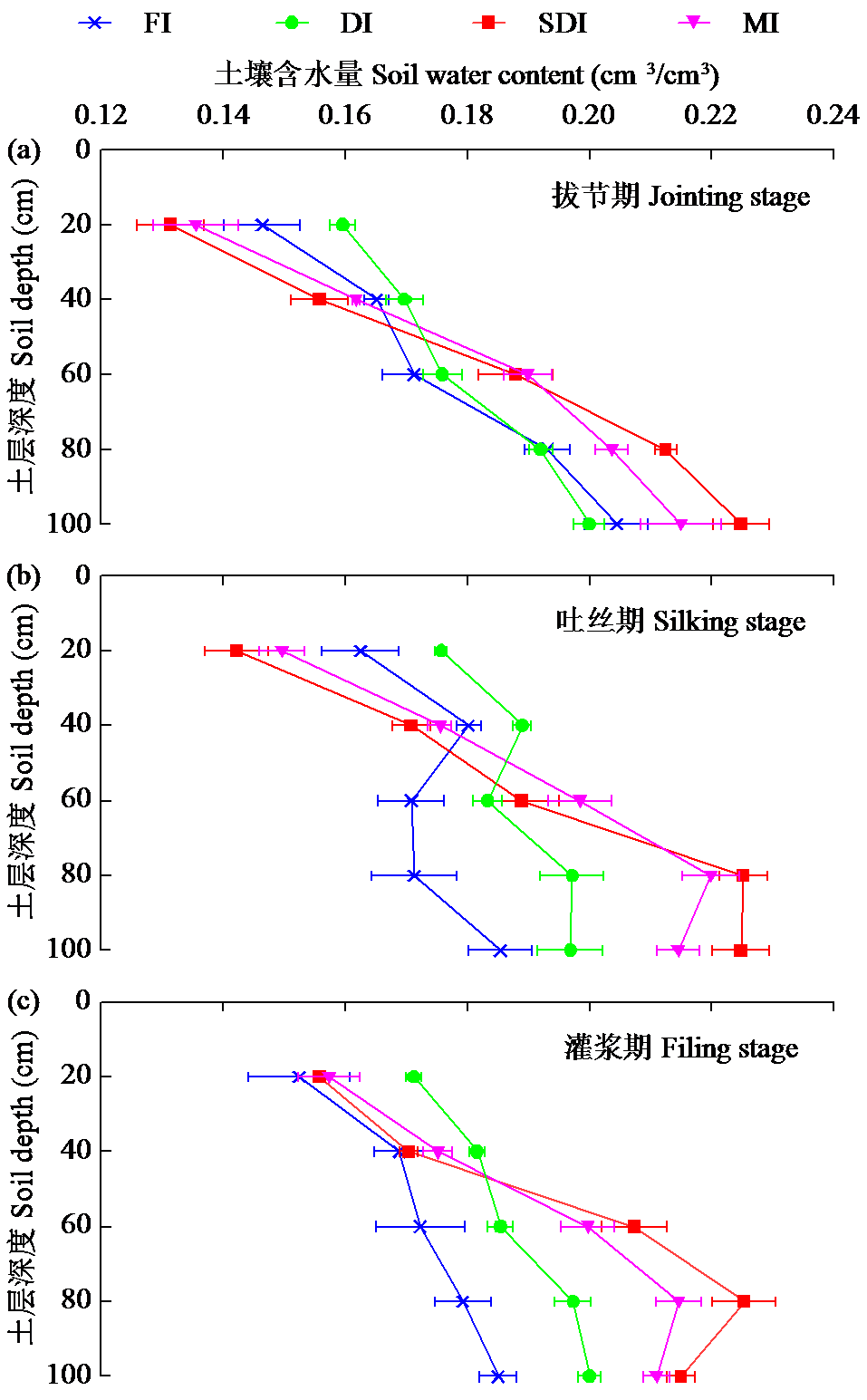 | 图2 不同节水灌溉方式下夏玉米土壤剖面的含水量 |