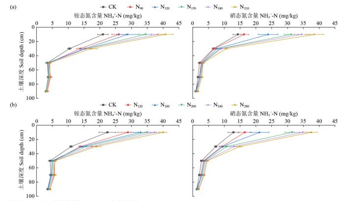 式中,ST为土层厚度(cm);SBD为土壤容重(g/cm3),0~20 cm为1.32 g/cm3,20~40 cm为1.35 g/cm3,40~60 cm为1.39 g/cm3,60~80 cm为1.41 g/cm3,80~100 cm为1.43 g/cm3;NC表示不同土层土壤NO3--N和NH4+-N(mg/kg)含量,n表示0~20、20~40、40~60、60~80和80~100 cm 5个土层剖面。