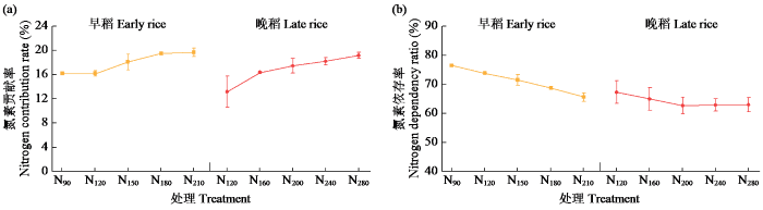 双季稻氮肥贡献率和土壤氮素依存率