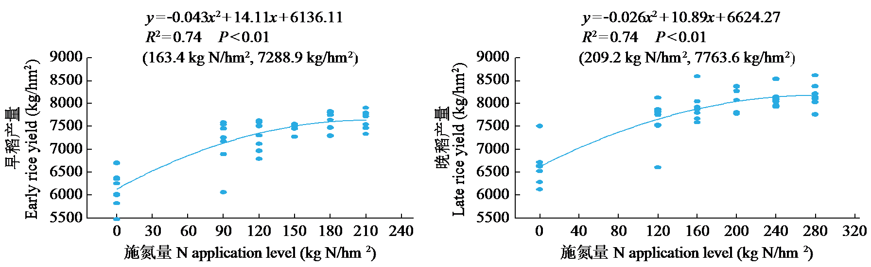 | 图3 早稻、晚稻产量和施氮量的一元二次回归分析 |
