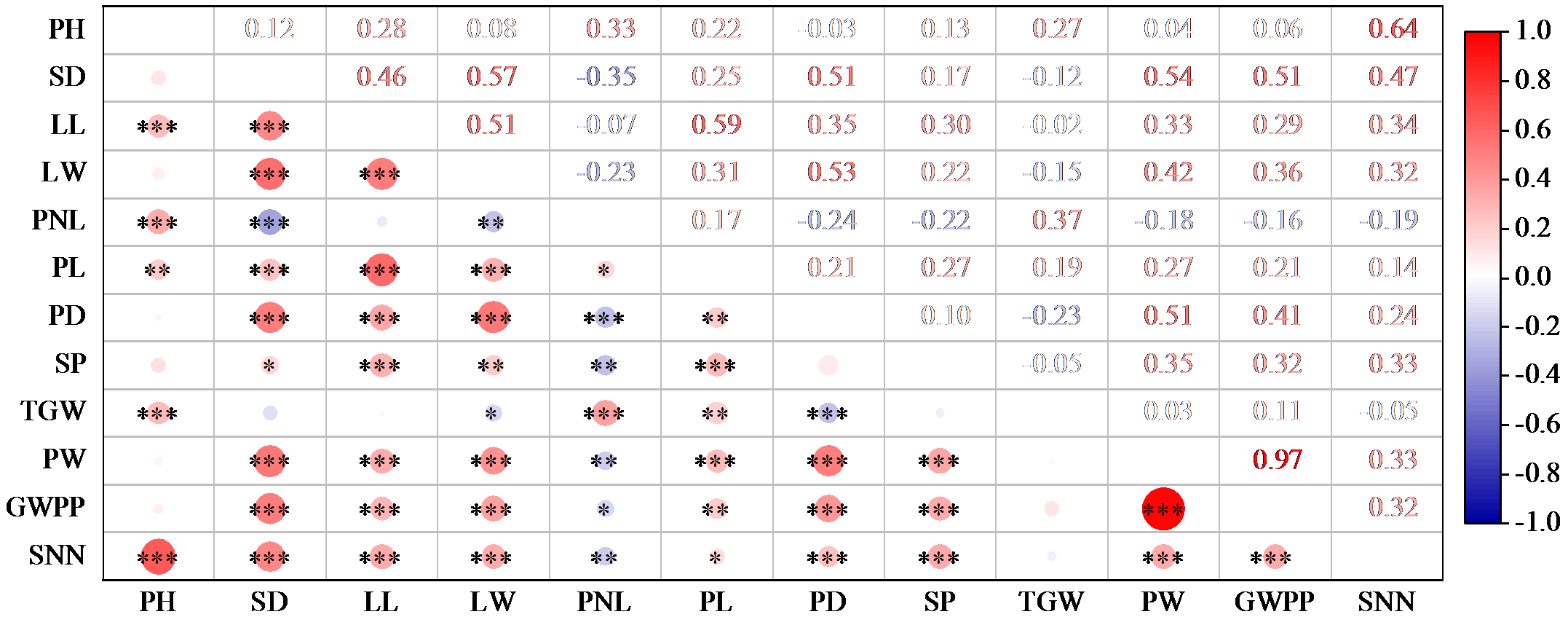 | Fig.1 Correlation analysis of the 12 agronomic traits PH: Plant height, SD: Stem diameter, LL: Leaf length, LW: Leaf width, PNL: Panicle neck length, PL: Panicle length, PD: Panicle diameter, SP: Spikelet number per panicle, TGW: 1000-grain weight, PW: Panicle weight, GWPP: Grain weight per panicle, SNN: Stem node number. |
