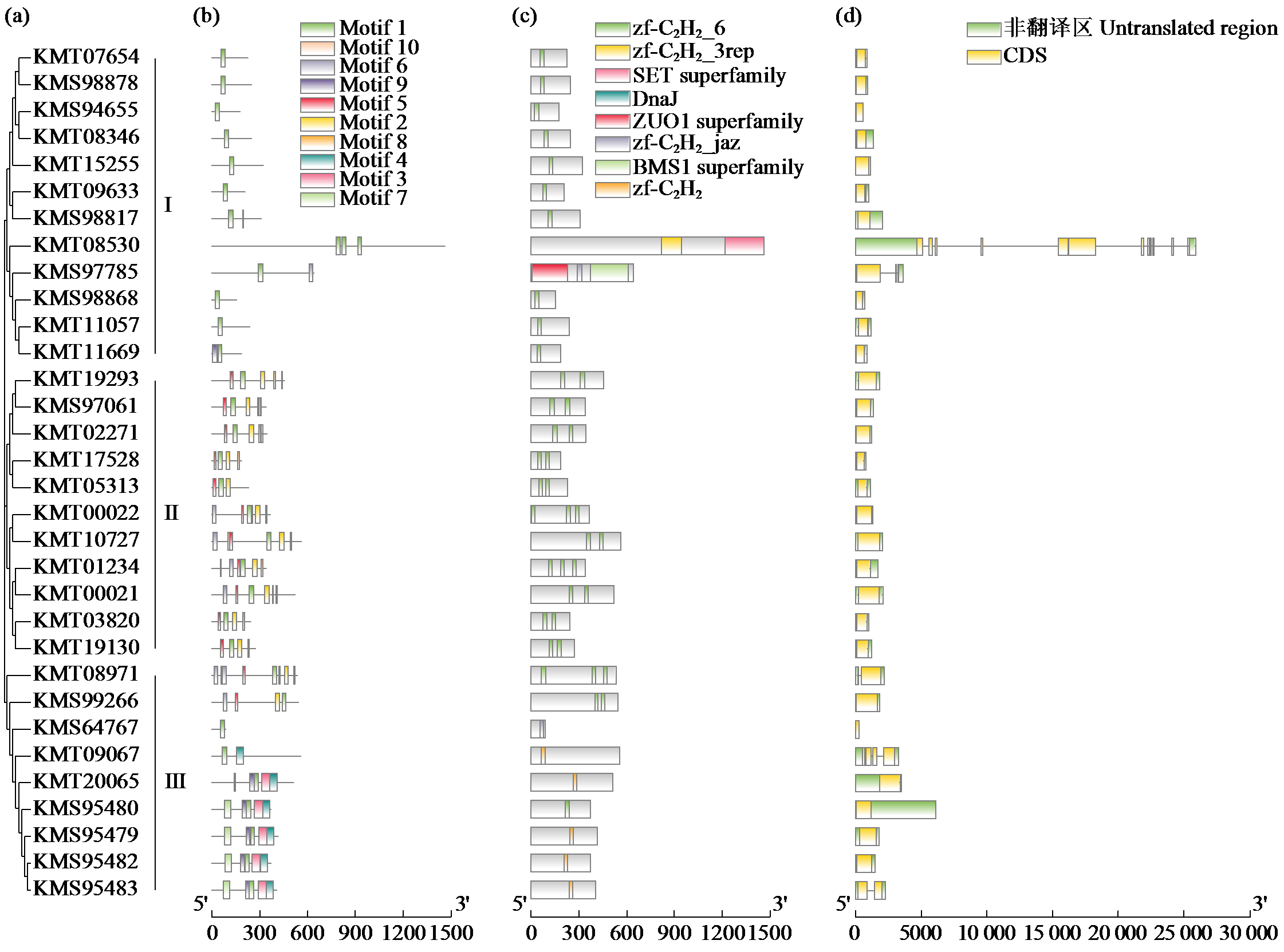 | Fig.2 Phylogenetic tree (a), conserved motifs (b), domains (c) and gene structure (d) analysis of C2H2 zinc-finger protein family members in sugar beet |