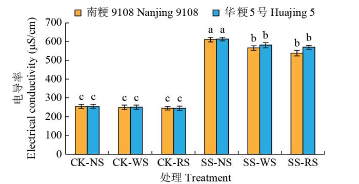 在CK条件下,与无秸秆(NS)处理相比,小麦秸秆(WS)和油菜秸秆(RS)处理使土壤电导率略有降低,但并无显著差异。在NS条件下,盐胁迫(SS)处理较CK显著提高了土壤电导率。在SS条件下,与NS相比,2种秸秆处理显著降低了土壤电导率,RS处理下的电导率低于WS处理,但两处理间差异并不显著(图1)。