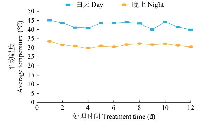 设置3个处理,分别为100%铵态氮(100:0铵硝混配营养)、75%铵态氮+25%硝态氮(75:25铵硝混配营养)和100%硝态氮(0:100铵硝混配营养)。所有处理的总氮(N)水平为0.95 mmol/L。NH4+-N营养以(NH4)2SO4加入,NO3−-N营养以Ca(NO3)2·4H2O加入,营养液除氮营养不同外,其他养分含量均按1/3强度的改良Hoagland营养液[18]略作修改,大量营养元素(mmol/L):KH2PO4 0.32,K2SO4 0.84,CaCl2 1.00,MgSO4⋅7H2O 1.70。微量营养元素(μmol/L):MnCl2·4H2O 9.10,85% H2MoO4 0.52,H3BO3 18.00,ZnSO4·7H2O 0.15,CuSO4·5H2O 0.16,Fe(III)-EDTA 150.00。为了消除环境微生物硝化作用,防止NH4+-N转化为NO3−-N,在所有处理中添加了7.00 μmol/L双氰胺(硝化抑制剂)。试验每6 d更换一次营养液,试验期间每天用1 mol/L HCl或NaOH溶液调节pH至5.5。处理12 d后分别测定水稻生物量、根系形态、Pro、MDA及抗氧化酶活性等指标,每个指标3次重复。采用HOBO光温测定仪连续记录每天的温度情况,试验期间温度如图1所示,白天平均温度在40~45 ℃,夜晚平均温度在30~35 ℃。